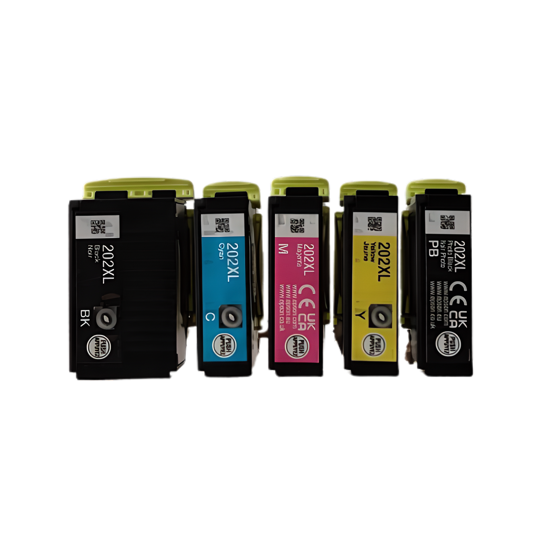 Kit composto da cinque cartucce Epson 202XL originali: NERO [C13T02G14010], NERO FOTO[C13T02H14010], CIANO [C13T02H24010], MAGENTA [C13T02H34010], GIALLO [C13T02H44010].